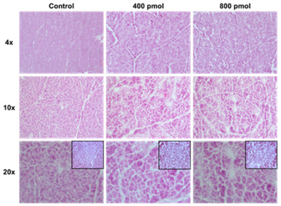 Tumor growth curve was compared from the day of the first injection (day 0) until the last day when all 40 mice remained included in the study (day 26) (Figure 4A,B). Tumor volumes from both 400 pmol and 800 pmol group were found to be significantly reduced in comparison to control group (p = 0.0001 and p = 0.0066, respectively) (Figure 4A). Moreover, relative tumor volume of 400 pmol group was found to be lower than that observed in the 800 pmol group (p = 0.0002) (Figure 4A). At later time points, some control mice tumors reached the limit size volume of 1500 mm3 and mice were therefore euthanized, whereas no tumor from the two treated groups reached this limit (Figure 4B, and Figure S1 for individual curves). Despite the fact that [177Lu]Lu-NeoB was no longer administered, a tumor regression was observed in 400 pmol and 800 pmol groups. From day 65, no residual tumor volume was found on any mice from the 400 pmol group. At the same time point (65 days) in the 800 pmol group 4 mice out of 13 had measurable tumors. This more pronounced effect of [177Lu]Lu-NeoB on tumor regression observed on 400 pmol in comparison to 800 pmol group is in accordance with the higher [177Lu]Lu-NeoB uptake in GRPR tumors (Figure 3). The efficacy of [177Lu]Lu-NeoB can also be represented using a survival graphic representation (Figure 4C). In this graphic it can be seen that the tumors in 5 out of 13 control mice reached the limit size during the 100 days period of follow-up, while none of the 400 pmol or 800 pmol mice were excluded due to an over limit tumor volume. No change was observed in total body weight of treated animals (Figure 4D), and no off-target effect, such as inflammation, fibrosis, or architecture alteration, was observed on HES stained pancreatic sections (Figure 5).