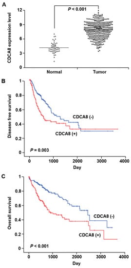 The correlation between CDCA8 overexpression and prognosis in hepatocellular carcinoma (HCC) patients. (A) Upregulation of CDCA8 in HCC tissues compared to that in adjacent noncancerous tissues (p < 0.001). (B,C) Associations between CDCA8 expression and the patient’s disease-free survival (p = 0.003) (B) and overall survival (p < 0.001) (C).