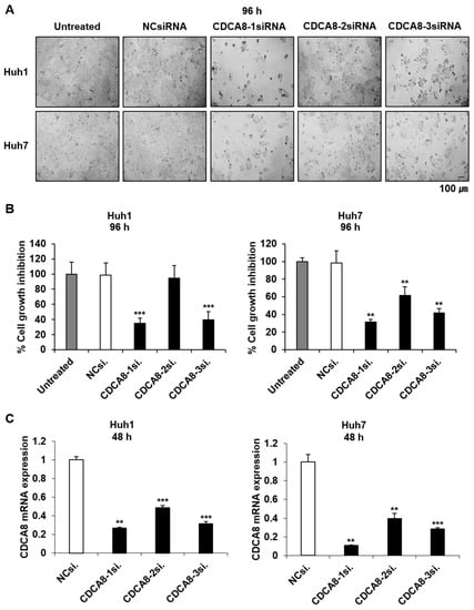 Silencing of CDCA8 suppresses HCC cell proliferation. (A) Light microscopy images of Huh1 and Huh7 cells 4 days after NCsiRNA or three kinds of CDCA8-specific siRNA transfection. Scale bar, 100 μm. (B) Growth inhibition of Huh1 and Huh7 cells treated with 15 nM siRNA for 4 days. (C) Detection of CDCA8 mRNA expression in Huh1 and Huh7 cells at 48 h after transfection. The data are shown relative to GAPDH expression and normalized to NCsiRNA treatment. NCsiRNA, negative control siRNA; CDCA8-1si., CDCA8-2si., CDCA8-3si., three different sequences of CDCA8-specific siRNA. All the data in this figure were statistically analyzed using the Bootstrap t-test. ** p < 0.01; *** p < 0.001 vs. control.