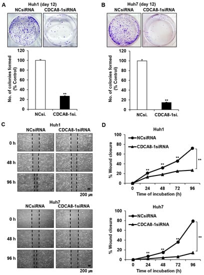Treatment of CDCA8-1siRNA decreases clonogenicity and migration ability in HCC cells. (A,B) Observation of changes in the clonogenicity of Huh1 (A) or Huh7 cells (B) after 12 days of siRNA treatment. The number of colonies was also measured in each cell line (** p < 0.01, by the Poisson generalized linear model). (C) Observation of HCC cell migration using a wound healing assay. Representative images were taken after 0, 48, and 96 h of siRNA treatment. Scale bars, 200 μm. (D) Wound closure was measured daily for up to 4 days and normalized to the time point of day 0 (** p < 0.01 by Bootstrap t-test, n = 3).