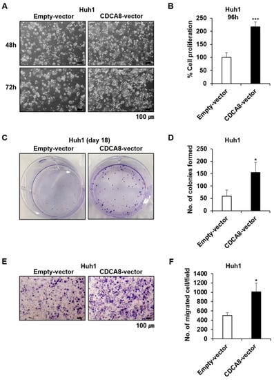 CDCA8 promotes proliferation and migration of CRC cells. (A,B) Representative light microscopy images (A) and the number of proliferative Huh1 cells (B) transfected with empty control vector or CDCA8-overexpressing vector for 96 h. (C,D) Observation of changes in the clonogenicity (C) and the number of colonies (D) after 18 days of the indicated treatments. (E,F) Representative light microscopy images (E) and the number of migratory Huh1 cells (F) transfected with empty control vector or CDCA8-overexpressing vector. Empty-vector, transfected with empty control vector; CDCA8-vector, transfected with CDCA8-expressing vector. * p < 0.05; *** p < 0.001 vs. control.