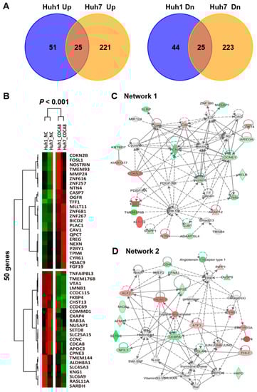 Global observation of dysregulated genes in HCC cells with CDCA8 depletion. (A) The number of genes dysregulated in Huh1 and/or Huh7 cells over 48 h of CDCA8-1siRNA treatment. (B) A heat map of the 50 commonly up- or downregulated genes in Huh1 and Huh7 cells. p < 0.001, red (upregulated) and green (downregulated). (C,D) Two putative ingenuity pathway analysis (IPA) top networks highly associated with PCNA (C) or ATF3 (D).