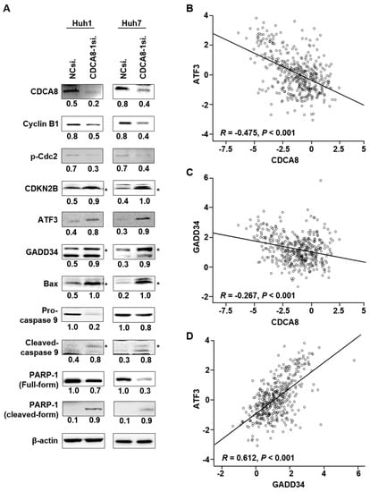 Targeting CDCA8 enhances apoptotic signaling through activation of the ATF3 and GADD34 tumor suppressors. (A) Western blot analysis of the expression of CDCA8 and the indicated proteins functionally related to cell proliferation, apoptosis, or cell cycle regulation. The proteins were prepared at 48 h after transfection with CDCA8-1siRNA. β-actin was detected as a loading control. * exact position of target protein band when measured with molecular weight markers (refer to Figures S5 and S6). (B–D) The correlation among the expressions of CDCA8, ATF3, and GADD34 in HCC tissues. TCGA data showed that CDCA8 had a negative correlation with ATF3 (B) and GADD34 (C), and there was a positive association between ATF3 and GADD34 (D).