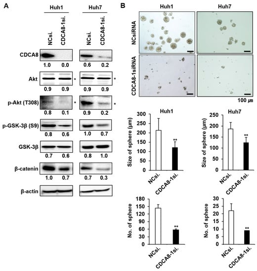 Silencing of CDCA8 inactivates AKT/β–catenin signaling and inhibits sphere formation. (A) Western blot analysis of CDCA8 and the indicated proteins functionally involved in AKT/β–catenin signaling. (B) Detection of sphere formation in HCC cells treated with NCsiRNA or CDCA8-1siRNA. * exact position of target protein band when measured with molecular weight markers (refer to Supplementary Figure S7). ** p < 0.01 vs. control. Scale bar = 100 μm.