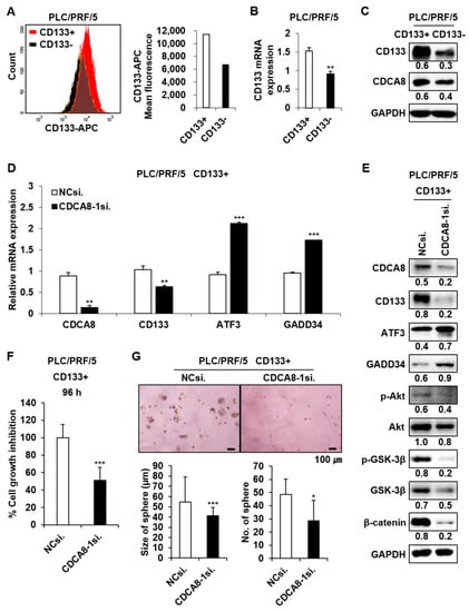 It was previously shown that GADD34 induces apoptosis through inactivation of Akt signaling [20], which contributes to tumor cell migration and invasion [21]. We observed here that the upregulation of GADD34 caused by CDCA8-1siRNA treatment induces a decrease in Akt activity (Figure 7A). GSK-3β is a downstream target of Akt. p-Akt phosphorylates GSK-3β at serine 9 and blocks β-catenin degradation to maintain CSC properties [22,23]. CDCA8 knockdown decreased the levels of p-GSK-3β and β-catenin in both examined HCC cells (Figure 7A). Given the functional significance of Akt signaling in CSC biology and the observation of Akt repression under the CDCA8 knockdown condition, we next chose to determine whether CDCA8 targeting could inhibit stemness in HCC. As expected, the treatment of CDCA8-1siRNA effectively suppressed sphere formation in both Huh1 and Huh7 cells compared to the control siRNA knockdown (Figure 7B). Next, on the basis of our previous observation that the upregulation of CSC marker CD133 contributes to liver tumor initiation [16], we investigated whether the expression of CD133 is also affected by CDCA8 silencing in the CD133+ HCC cell population. To accomplish this, the PLC/PRF/5 cell line was chosen, as it was previously reported that the PLC/PRF/5 cell line contains the highest levels of the CD133+ cell population among generally available HCC cell lines [24]. First, it was demonstrated that the silencing of CDCA8 decreases mRNA expression of CSC marker CD133 in the PLC/PRF/5 parental cell culture (Figure S4). The CD133+ CSC population was then sorted from the CD133− population of PLC/PRF/5 cells by FACS using an APC-conjugated CD133 antibody (Figure 8A,B). The levels of CDCA8 and CD133 in the CD133+ CSC portion were significantly higher than in the CD133− portion (Figure 8C). CDCA8 knockdown decreased CD133 expression and increased the levels of ATF3 and GADD34 in the CD133+ CSC population (Figure 8D,E). Under the same condition, the AKT/β–catenin signaling axis was also inactivated (Figure 8E). These molecular changes reflected the inhibition of growth and spheroid formation in the CD133+ cell population (Figure 8F,G). These data imply the possibility that CDCA8 is functionally associated with cancer stemness, and that CDCA8 knockdown could block the migratory and invasive properties of primary HCC by eliminating CSCs in the tumor microenvironment.