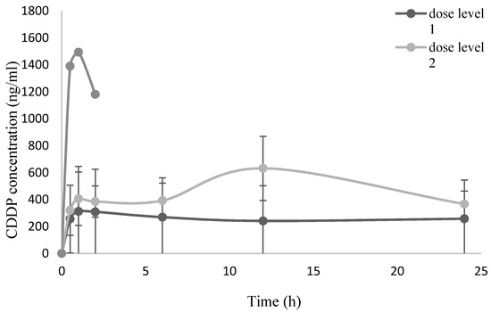 Regarding cisplatin, we observed a platinum peak of 1494 ng/mL in the third dose level: we can compare it to data from literature where, with a dosage of 20 mg/m2/day over five days, a mean CDDP serum peak level of 1.89 μg/mL is reported [35]. Furthermore, as reported in the literature, the highest concentrations observed for CDDP are lower than the ones obtained after intravenous injection of cisplatin at 100 mg/m2 [36]. The pharmacokinetics results highlighted a very slow decrease of the plasma concentration of CDDP and OXA over time. This behavior can be related to the binding of the two platin compounds to the plasma albumin [37,38].