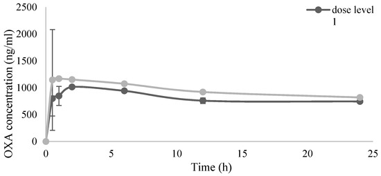 OXA plasma concentration (ng/mL) over time after PIPAC procedure. Results are expressed as mean ± SD.