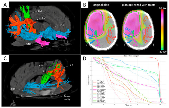 Integration of multiple white matter tracts as depicted by MR Tractography in the tomotherapy RT planning. (A,C) Post-surgical MR tractography analysis of a glioblastoma (GBM) patient: The upper image (A) shows the reconstructed tracts in the contralateral (healthy) hemisphere, while the lower image (C) shows the tracts surrounding the surgical cavity in the ipsilateral (affected) hemisphere. CST = corticospinal tract; IFOF = Inferior fronto-occipital fasciculus; UNC = uncinate fasciculus; SLF = superior longitudinal fasciculus. (B) Comparison of dose distributions for the original plan (on the left) and the tract-optimized plan (on the right), showing the different dose conformation outside the target and the preservation of relevant tracts. (D). The dose-volume histograms (DVH) data for the two planning modalities in B is shown. DVH for each tract in the original plan is represented with solid lines, while DVH for each tract in the new plan incorporating the fibers is represented with dotted lines. ‘I’ indicates ipsilateral tracts, while ‘C’ indicates contralateral tracts. A significant reduction of the dose delivered to tracts was observed when fibers were included in the optimization process, which was more relevant for contralateral tracts. No significant differences were found in PTV coverage between the original plans and the optimized plans incorporating fiber tracts (solid and dotted red lines). Adapted with permission from [87].