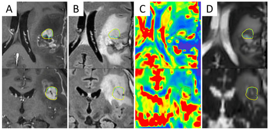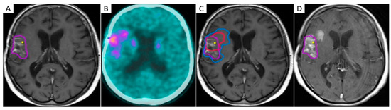 In recurrent gliomas, standard procedures have not yet been established. However, the aim is to limit the re-irradiated volume to the absolutely necessary, i.e., to the active tumor region, to enhance efficacy and decrease possible neurotoxicity. The delineation of tumor volume should, therefore, be restricted to the contrast-enhancing T1 abnormality. Unfortunately, anatomical contrast-enhanced T1-weighted MRI is not suited for differentiating tumor progression from radiation necrosis and therapy-related changes [95,171,172]. For these reasons, imaging techniques capable of better detailing the entire extent of tumor recurrence and patterns of infiltration are needed to optimize radiation treatment volumes [51] (Figure 5).