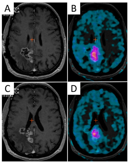 - Matsuo, M.; Miwa, K.; Tanaka, O.; Shinoda, J.; Nishibori, H.; Tsuge, Y.; Yano, H.; Iwama, T.; Hayashi, S.; Hoshi, H.; et al. Impact of [11C]methionine positron emission tomography for target definition of glioblastoma multiforme in radiation therapy planning. Int. J. Radiat. Oncol. Biol. Phys. 2012, 82, 83–89. [Google Scholar] [CrossRef] [PubMed]