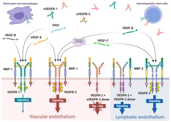 The expression of VEGFR-1 occurs predominantly on endothelial cells of blood vessels, but also on monocytes and macrophages, placental trophoblasts as well as renal mesangial cells [,]. Similarly, VEGFR-2 occurs mostly on blood vessel endothelium, as well as platelets, haematopoietic and retinal stem cells. Both receptors are clearly expressed on cell surfaces of solid cancers and haematopoietic system neoplasms [,]. VEGFR-3 expression is specified only on endothelial cells of lymphatic system []. Therefore, a substantial share of VEGFR-1 and VEGFR-2 on vascular endothelium shows their significant contribution in angiogenesis, while VEGFR-3 and NRP-2 highly contribute in lymphangiogenesis [,].