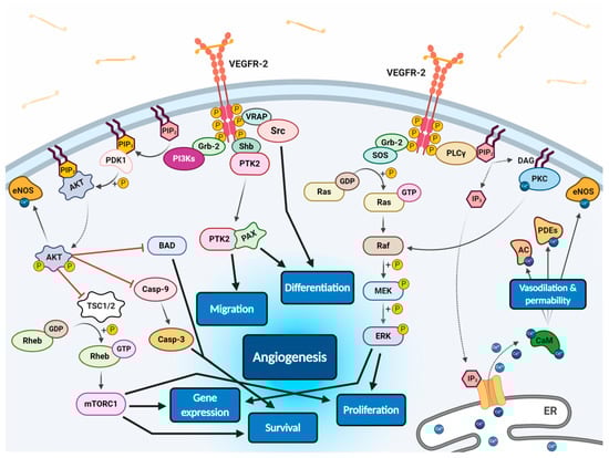 All VEGF isoforms that bind selectively to VEGFR-2 are capable to elicit receptor autophosphorylation, thus triggering the activation of numerous intracellular signalling pathways (Figure 2) [,,,,]. Phosphorylated receptor subunits bind many adaptor molecules such as Shb (SH2 domain-containing adapter protein B), SOS (Son of sevenless proteins) or Grb-2 (Growth factor receptor-bound protein 2) that activate Ras GPTase. This last protein stimulates MAPK pathway responsible for endothelium proliferation. Simultaneously, phosphorylated intracellular VEGFR-2 domain activates phospholipase C-gamma (PLC-γ), which catalyses hydrolysis of phosphatidylinositol bisphosphate (PIP2) to inositol triphosphate (IP3) and diacylglycerol (DAG). IP3 triggers intracellular release of Ca2+ form endoplasmic reticulum, which employs calcium modulated protein calmodulin to stimulate cAMP phosphodiesterase, adenylate cyclase and site-specific endothelial NO synthase (eNOS) and consequently increase NO-driven vasodilation and vascular permeability. However, DAG activates calcium-dependent protein kinase C (PKC), a multi-target kinase stimulating indirect cell proliferation and migration. Additionally, phosphorylated VEGFR-2 induces protein kinase B (commonly known as AKT) at the beginning of PI3K/AKT/mTOR pathway, an important signalling regulator of the cell cycle and metabolism, reducing risk of apoptosis and promoting cellular transcription, proliferation and migration [,]. Moreover, phosphorylated VEGFR-2 activates signalling of focal adhesion kinase (FAK) observed during cellular migration, adhesion, cytoskeleton rearrangement and tumour progression [,]. Nevertheless, it was observed that VEGF-A can regulate endothelial cell attachment independently of VEGFR-2 through NPR-1 [].