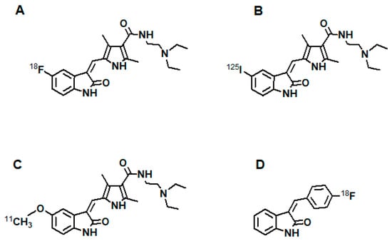 - Kuchar, M.; Oliveira, M.C.; Gano, L.; Santos, I.; Kniess, T. Radioiodinated sunitinib as a potential radiotracer for imaging angiogenesis-radiosynthesis and first radiopharmacological evaluation of 5-[125I]Iodo-sunitinib. Bioorg. Med. Chem. Lett. 2012, 22, 2850–2855. [Google Scholar] [CrossRef] [PubMed]