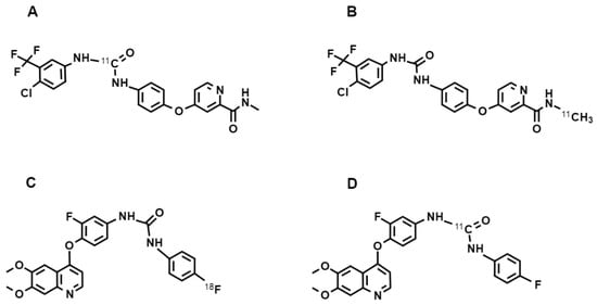 - Poot, A.J.; van der Wildt, B.; Stigter-van Walsum, M.; Rongen, M.; Schuit, R.C.; Hendrikse, N.H.; Eriksson, J.; van Dongen, G.A.M.S.; Windhorst, A.D. [11C]Sorafenib: Radiosynthesis and preclinical evaluation in tumor-bearing mice of a new TKI-PET tracer. Nucl. Med. Biol. 2013, 40, 488–497. [Google Scholar] [CrossRef]