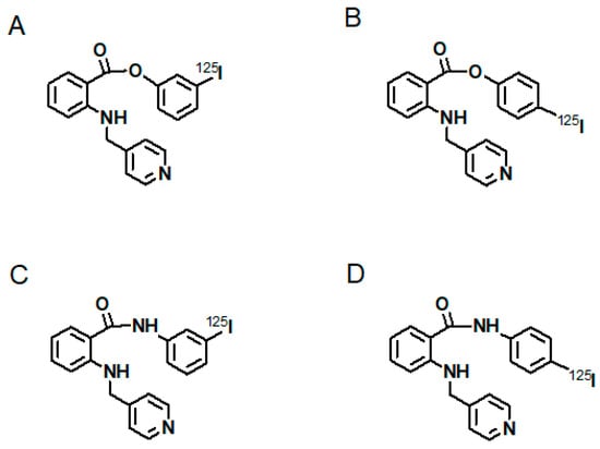 - Hirata, M.; Asanom, A.; Magata, Y.; Ohmomo, Y.; Temma, T. Synthesis and evaluation of novel radioiodinated anthranilate derivatives for in vivo imaging of vascular endothelial growth factor receptor with single-photon emission computed tomography. Ann. Nucl. Med. 2020, 34, 486–495. [Google Scholar] [CrossRef] [PubMed]
