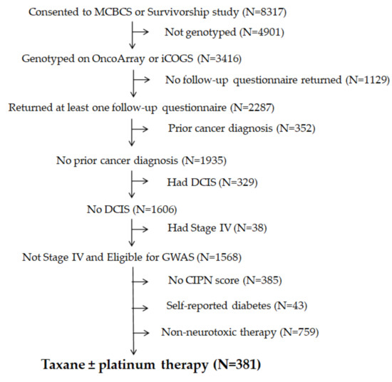 A separate clinical observational cohort was made up of breast cancer patients from the Mayo Clinic Breast Disease Registry (MCBDR), an ongoing longitudinal cohort that enrolls patients diagnosed with breast cancer within the prior year. Participants completed questionnaires at baseline and during follow-up, approximately annually (by mail), and allowed for reviews of their medical records and access to tumor tissue when available. More than 8000 patients have consented to participate in the MCBDR since 2003, with accrual rates currently approximating 600/year (70–80% of those approached). Patients with prior cancers, ductal carcinoma in situ (DCIS)/stage 0, stage-4/metastatic breast cancer, and self-reported diabetes were excluded from the GWAS analysis, and the patients included in the analyses were those who returned at least one follow-up questionnaire that included EORTC QLQ-CIPN20, who had received a paclitaxel and platinum compound, and for whom genotyping had been performed (Figure 1). All the participants in these studies signed an Institutional Review Board (IRB)-approved informed consent, in accordance with federal and institutional guidelines.