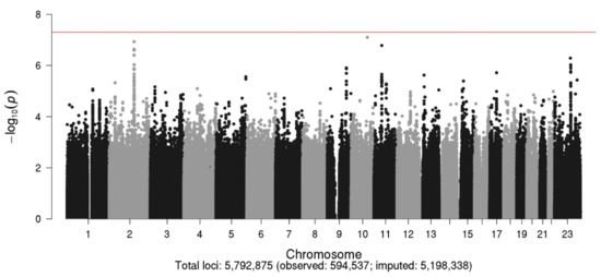 - Das, S.; Forer, L.; Schonherr, S.; Sidore, C.; Locke, A.E.; Kwong, A.; Vrieze, S.I.; Chew, E.Y.; Levy, S.; McGue, M.; et al. Next-generation genotype imputation service and methods. Nat. Genet. 2016, 48, 1284–1287. [Google Scholar] [CrossRef]