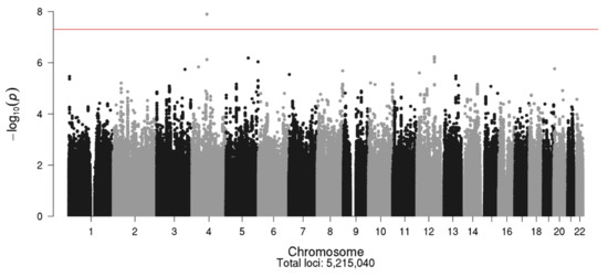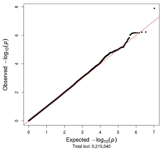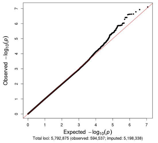 The Manhattan and Q–Q plots for the N08Cx GWAS study are shown in Figure 2 and Figure 3, respectively. Though no SNPs achieved genome-wide significance (p < 5.0 × 10−8), the rs5636021 SNP on chromosome 10 near the PDE6C gene approached this level of significance (p = 7.92 × 10−8).