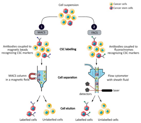 MACS is a magnetic-based cell isolation technique, using a positive selection strategy, presented in Figure 1 panel 1 [44]. Magnetic beads are conjugated to highly specific monoclonal antibodies that recognize CCSC marker on the surface of cells of interest. Then, the heterogeneous suspension of cells is passed through a separation column, in a magnetic field, to retain the cells labeled with magnetic beads and antibodies [45]. By switching off the magnetic field, target cells will be eluted. MACS is a fast and easy method of cell separation, especially for the isolation of CCSCs that represent a small cell population in the tumor mass. However, MACS is only a mono-parameter separation method that requires cell labelling and is unable to separate cells based on the variable expression of markers [44,45].
