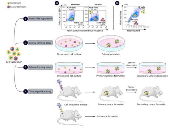 CCSCs have many intrinsic properties that can be used to identify them, such as their capacity for self-renewal, multi-lineage differentiation, detoxification due to aldehyde dehydrogenase 1 (ALDH1) activity and dye exclusion ability, colony/sphere formation and tumorigenicity, which are illustrated in Figure 2. These functional characteristics have been used to develop effective methods for isolating CCSCs. The ALDH activity assay is based on the use of a fluorescent and non-toxic ALDH substrate that freely diffuses into intact and viable cells [47]. Then, in the presence of the detoxifying enzyme ALDH, the substrate is converted into a negatively charged fluorescent product that is retained inside the cells. Thus, cells with high ALDH activity become brightly fluorescent and can be measured by flow cytometry as presented in Figure 2 panel 1a [47,48]. CCSCs increase their ALDH1 activity to resist to chemotherapeutic agents and prevent apoptosis by maintaining low levels of reactive oxygen species [47]. The advantage of the ALDH assay is high stability compared to the use of surface markers, but its specificity is low due to its expression in both normal SCs and CSCs [48].