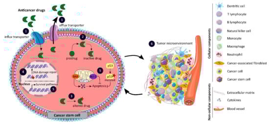 The effectiveness of current anticancer therapies is limited by the resistance of tumors to chemotherapy and targeted molecular therapies [99]. Resistance to anticancer drugs may be intrinsic, meaning that it occurs prior to treatment and involves pre-existing resistance factors in the mass of tumor cells, or it may be acquired during the treatment of tumors that were initially sensitive due to the induction of various adaptive responses [99]. Furthermore, due to the high degree of tumor heterogeneity, drug resistance may also result from the therapy-induced selection of a drug-resistant tumor subpopulation, such as CCSCs [99]. A wide range of molecular mechanisms are involved in drug resistance, as illustrated in Figure 4, and will be detailed in this chapter [74].