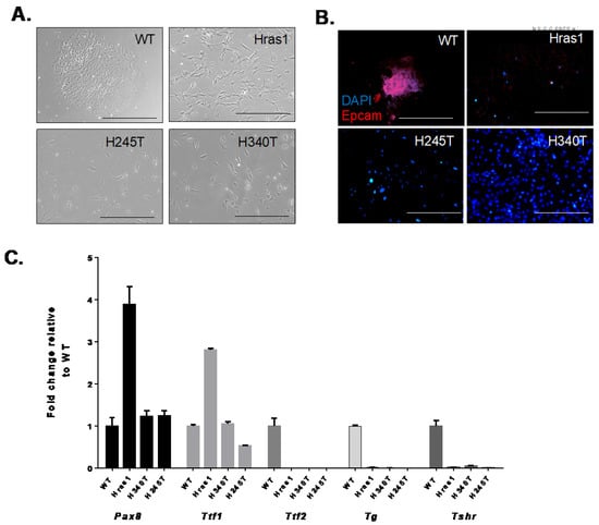 Morphological features and expression of thyroid-specific genes in HrasG12V/Pten−/−/TPO-Cre (Hras1, H245T, and H340T) thyroid tumor cell lines. (A) Phase-contrast images (10×) of primary wild-type (WT) thyrocytes and thyroid tumor cell lines in culture. Scale bar represents 400 μm. (B) Fluorescent imaging (20×) of EpCAM immunostained WT (positive control) thyrocytes and thyroid tumor cell lines in culture. Scale bar represents 200μm. Nuclei are stained with 4′, 6-diamidino-2-phenylindole (DAPI). (C) Real-time PCR analysis of the expression levels of thyroid-specific genes in primary wild-type (WT) thyrocytes and thyroid tumor cell lines in culture. Data are representative of three independent experiments. Each sample was analyzed in triplicate (n = 3).