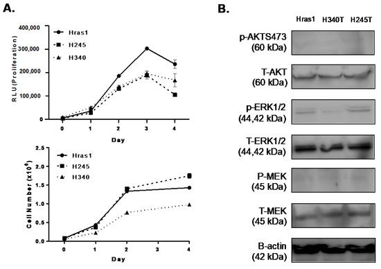 We next determined the growth rates of the cell lines in culture (Figure 3A) using the CellTiterGlo luminescence-based viability assay (Promega) and analysis of raw cell numbers. The CellTiterGlo method is based on the quantification of ATP amounts to determine the number of metabolically active cells. This method demonstrated a lag-phase of approximately 24 h after baseline measurements (Figure 3A, top). Cells had comparable growth rates, with Hras1 exhibiting the fastest rate of growth, and by day 3 cell growth began to decline. Analysis of raw cell numbers similarly demonstrated an initial lag-phase with stabilization of cell number around day 3 (Figure 3A, bottom). However, Hras1 and H245T exhibited roughly equal rates of growth that were not reflected in the ATP-based method of assessing proliferation. These results may indicate slight differences in metabolic activities of the individual cell lines. Nonetheless, Western blot analysis demonstrated that all cell lines had roughly equivalent levels of MAPK activation, particularly in regard to phosphorylated AKT (pAKT), phosphorylated ERK1/2 (pERK1/2) and phosphorylated MEK (pMEK) (Figure 3B).