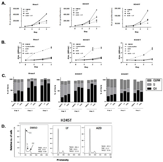 We next evaluated the efficacy of pathway-specific inhibitors on the growth of HrasG12V/Pten−/−/TPO-Cre cell lines by treating cells with LY294002 (PI3K inhibitor) and AZD6244 (MEK inhibitor) alone or in combination for 72 h. In all cell lines, the inhibition of PI3K or MEK alone resulted in a significant reduction growth (Figure 4A), although H245T appeared to be slightly more resistant to PI3K inhibition alone. Dual inhibition of MEK and PI3K resulted in further reductions in growth.