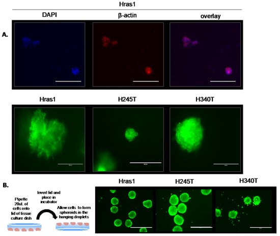 Development of physiologically relevant three-dimensional in vitro tumor models. (A) Representative images of HrasG12V/Pten−/−/TPO Cre cell lines (Hras1, H245T, H340T) grown embedded in Matrigel to produce 3D spheroids. Spheroids were fixed and stained for β-actin and counterstained with DAPI (top) or stained with fluorescently conjugated phalloidin antibody (bottom). Scale bars represent 200 µm. (B) Left: Schematic depicting process by which spheroids in hanging droplets are generated. Right: Spheroids collected after 7 days were labeled with Calcein-AM to assess viability. Scale bars represent 400 µm. Images are representative of three independent experiments.