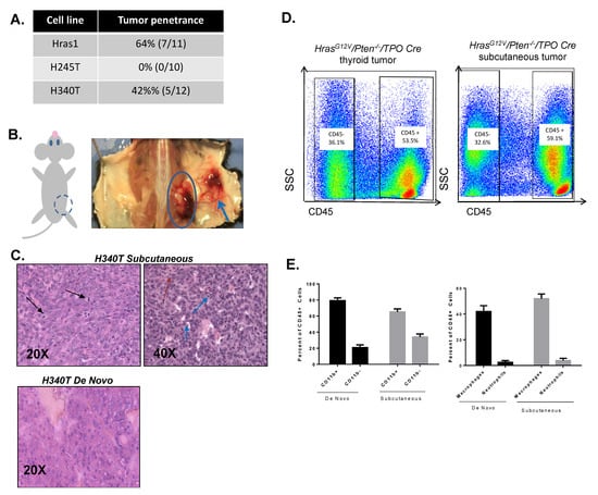 Development of syngeneic tumor model. (A) Tumor penetrance rates for all HrasG12V/Pten−/−/TPO-Cre thyroid tumor cell lines (Hras1, H245T, H340T) representing the number of mice with visible or palpable tumors as a percentage of total mice injected. Mice were monitored for 15 weeks, at which point all were sacrificed. Subcutaneous injections were repeated at least three times with each experiment including ten or more recipient mice (n = 10–12). (B) Gross image of subcutaneous tumor (blue circle) and neovascularization (arrow) on the right hind flank of a wild-type (WT) recipient in comparison to the control contralateral hind flank. (C) H&E staining of subcutaneous tumor sections derived from subcutaneous HrasG12V/Pten−/−/TPO-Cre thyroid tumor cells (H340T). Subcutaneous tumors were poorly differentiated or anaplastic with multiple mitotic cells (top left, black arrows) in addition to nuclear vesicular changes (top right, red arrow) and prominent nucleoli (top right, blue arrows). In contrast to H340 source tumor (bottom), subcutaneous tumors demonstrated complete loss of normal follicular pattern. (D) Representative FACS analysis of CD45+ immune cell population in de novo HrasG12V/Pten−/−/TPO-Cre thyroid tumor (left) and subcutaneous tumor (right) derived from an HrasG12V/Pten−/−/TPO-Cre cell line (H340T). Original blots see Figure S1 (E) FACS analysis of immune cells within the TME of de novo HrasG12V/Pten−/−/TPO-Cre tumors and subcutaneous tumors derived from H340T. Results demonstrate both models are enriched with cells of the myeloid lineage (CD11b+, left). Within the myeloid lineage, macrophages represent the largest percentage of cells in the TME (right) All groups were compared via two-way ANOVA with Sidak test for multiple comparisons. No statistically significant differences between models were detected.