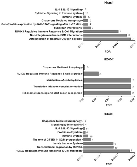 Proteomic analysis of conditioned media from HrasG12V/Pten−/−/TPO-Cre thyroid cell lines. Pathway analysis results comparing secretions from HrasG12V/Pten−/−/TPO-Cre thyroid cell lines (Hras, H245T, H340T) and wildtype thyrocytes. Reactome pathway database was queried for all secreted proteins that were statistically different from wildtype (multiplicity adjusted p-value of ≤0.05) and demonstrated at least a two-fold increase or decrease in secretion. False discovery rate (FDR) values were calculated using REACTOME software and over-representation analysis to determine significance. Numbers in bar graphs represent the number of proteins found within each pathway. Proteomics analysis was conducted on three independent conditioned media isolations (n = 3).