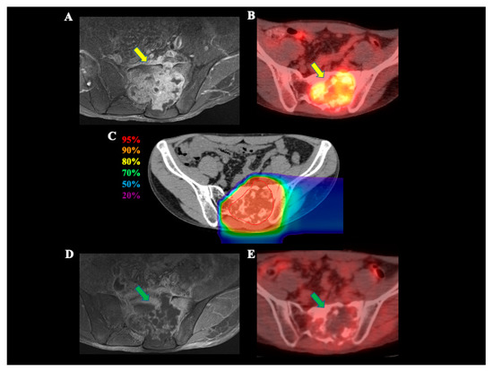 A 24-year-old male with sacral chondrosarcoma treated with C-ion RT. (A) Contrast-enhanced MRI before treatment. The yellow arrow shows the tumor with contrast enhancement. (B) FDG-PET before treatment. The yellow arrow shows the tumor with abnormal FDG uptake. (C) Dose distribution on axial CT images. The area within the red outline is GTV. Highlighted are the 95% (red), 90% (orange), 80% (yellow), 70% (green), 50% (blue), and 20% (purple) isodose curves (100% was 70.4 Gy [RBE]). (D) Contrast-enhanced MRI 3 months after treatment. The tumor contrast effect is decreased compared to that before treatment (green arrow). (E) FDG-PET 3 months after treatment. FDG uptake is decreased compared to that before treatment (green arrow). Abbreviations: C-ion RT, carbon ion radiotherapy; CT, computed tomography; FDG-PET, 2-deoxy-2-[18F] fluoro-D-glucose (FDG)-positron emission tomography (PET); GTV, gross tumor volume; MRI, magnetic resonance imaging; RBE, relative biological effectiveness.