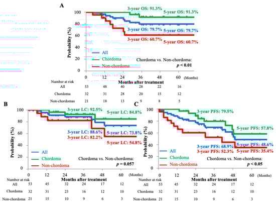 There were significant differences in OS and PFS by the histological type (chordoma or non-chordoma) (p < 0.01 and p < 0.05) while the difference in LC did not reach the significant level (p = 0.057). There were significant differences in clinical outcomes between chordoma and non-chordoma patients; therefore, we analyzed prognostic factors for these two histological types separately.