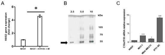 Once at confluence, the CM was collected and used for the treatment of human normal dermal fibroblasts (NHDF). An induction of HAS2 gene was observed in NHDF cultured for 72 h in the presence of 8701-BC CM (Figure 1A). We focused on the analysis of HAS2 as it shows the highest HA production in tissues [32].