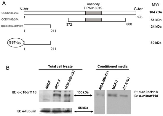Figure 2. C10orf118 is found both in cell lysate and secreted media of different breast cancer cell lines. (A) Schematic view of the different isoforms of c10orf118 protein as reported by ensembl.org database, reporting the amino acid position and the molecular weight. Grey box depicts the region recognized by the antibody HPA018019 (Sigma Aldrich) and schematic view of the c10orf118 human recombinant peptide bearing the first 211 amino acids and a GST tag at N-terminal position. (B) Left panel, immunoblot of c10orf118 (full size, arrow) and tubulin in 30 μg of total proteins of cell lysate from NHDF, MCF-7 and MDA-MB-231 cells, respectively; right panel, immunoprecipitation and immunoblot of c10orf118 (full size, arrow) in 25 μL CM from culture of MDA-MB-231 and MCF-7.