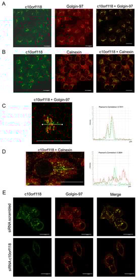 Based on the in silico studies presented in Supplementary Table S2, we sought to explore the localization of the c10orf118 protein within the cell by using confocal fluorescence microscopy. MCF-7 cells were fixed and stained with antibodies against c10orf118 and either Golgin-97, which is a specific Golgi apparatus protein (Figure 3A), or calnexin, a membrane protein of the endoplasmic reticulum (ER) (Figure 3B). Although the primary sequence of c10orf118 contains a KDEL signal at position 677–680, compatible with the retention in the ER, confocal images revealed a preferential localization in the Golgi apparatus (Pearson’s Correlation = 0.7011 and 0.3804 in Golgi and ER, respectively). This result was also supported by the high-resolution line-scan performed on Z stacks images with thickness of ~0.25 µm (Figure 3C,D). As a control, MCF-7 were nucleofected for 48 h with 30 nmol of siRNA against c10orf118 or scrambled siRNA, plated on coverslips, fixed and stained with antibodies against c10orf118 and Golgin-97. The silencing of c10orf118 showed a weaker (green) signal in the Golgi apparatus of MCF-7 cells stained with the antibody against c10orf118, confirming its subcellular localization (Figure 3E). All the images were taken with a 63X objective using a Leica TCS SP5 instrument.