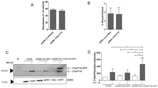 Figure 4. Role of C10orf118 in MCF-7 cell function. (A) MTT assay of MCF-7 cells nucleofected with 30 pmol of a siRNA against c10orf118 or a scrambled siRNA. Data are expressed as percentage of control ± S.D. of three independent experiments. (B) Wound healing assay performed in MCF-7 cells nucleofected with 30 pmol of siRNA against c10orf118 or scrambled control. The graph represents the percentage of wound closure ± S.D after 24 h from the initial scratch of four independent experiments. Images were analysed using the software tool TScratch. (C) Western blot of 30 µg of MCF-7 cells lysates nucleofected for 48 h with an overexpressing vector for c10orf118 (pCMW-AC-c10orf118-GFP) or the relative empty vector (pCMW-AC-GFP) and treated with 5 µM MG-132 for 24 h. M = protein marker. The images report a representative immunoblot for c10orf118 and GAPDH and (D) the relative quantification. The analysis was performed measuring the optical density of the bands and values are expressed as percentage variation of the control ± S.D. of four independent experiments. * p < 0.05, ** p < 0.01, and *** p < 0.001.