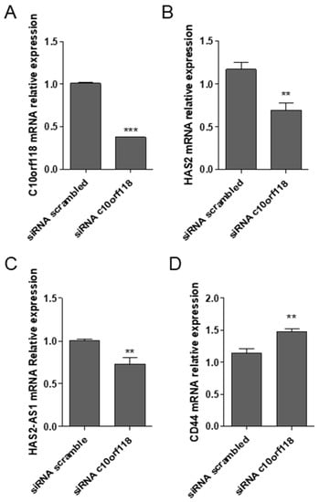 Figure 5. c10orf118 silencing influences HA-related genes expression in MCF-7. Quantitative RT-PCR analyses of MCF-7 cells nucleofected for 48 h with 30 pmol of c10orf118 siRNA or a scrambled siRNA. The graphs represent the mRNA levels of (A) c10orf118, (B) HAS2, (C) the long non-coding RNA HAS2-AS1 and (D) the HA receptor CD44. Data are represented as mean ± S.D. of six independent experiments. ** p < 0.01, and *** p < 0.001.