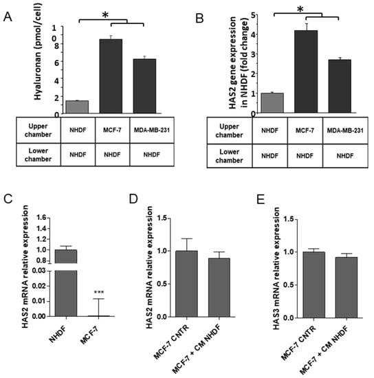 Figure 6. Effects of fibroblasts/breast cancer cells co-culture on HA production and HAS2 gene expression. (A) HA secretion detected by HPLC in the culture medium and (B) HAS2 expression in NHDF co-cultured with MCF-7 and MDA-MB-231 cells (see Materials and Methods). Bars represent mean ± S.D. of triplicate samples. (C) Quantitative RT-PCR of HAS2 expression in NHDF and MCF-7 cells. (D) Relative gene expression of HAS2 and (E) HAS3 in MCF-7 cells grown for 24 h in the absence (CNTR) or presence of NHDF conditioned media (+ CM NHDF). * p < 0.05, *** p < 0.001.