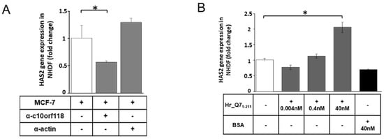 Figure 7. Specificity of c10orf118 effect on HAS2 synthesis by NHDF. (A) Quantitative RT-PCR analysis of HAS2 expression by NHDF co-cultured with MCF-7 alone or in the presence of an anti-c10orf118 polyclonal antibody or an anti-α-actin antibody as negative control. Each bar represents mean ± S.D. of triplicates. * p < 0.05. (B) Quantitative RT-PCR analysis of HAS2 expression by NHDF in the presence of increasing concentrations of a recombinant c10orf118 peptide (Hr_Q71-211). Bars represent mean ± S.D. of three replicates. * p < 0.05.
