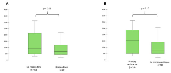| Responders (pg/mL) | Non-Responders (pg/mL) | p | Yes (pg/mL) | No (pg/mL) | p | ||