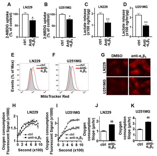 Because integrin αvβ3 knockdown inhibits glycolysis and promotes mitochondria OXPHOS, we next examined whether αvβ3 integrin engagement with osteopontin is required for regulation of glucose metabolism in GBM cells. We chose to examine αvβ3 and osteopontin engagement on glucose metabolism because their interaction is an important signaling events in GBM tumor invasion and growth [1,2,3,6,11]. LN229 and U251MG GBM cells were plated on osteopontin (10 μg/mL) coated plate in the presence or absence of anti-αvβ3 blocking antibody as described previously [1,11], then glucose uptake, glycolysis, and mitochondrial activity were measured (Figure 2). Glucose uptake was significantly decreased in LN229 and U251MG cells treated with αvβ3 blocking antibody when compared to that in cells treated with control antibody (Figure 2A,B). The lactate levels in the culture medium were significantly lower in LN229 and U251MG cells treated with αvβ3 blocking antibody (Figure 2C,D). In addition, blocking of αvβ3 integrin engagement with osteopontin significantly increased MitoTracker labeling in both LN229 and U251GM cells, indicating enhanced mitochondrial membrane potential and activity (Figure 2E,F). Consistent with the flow cytometry results, imaging of MitoTracker labeled cells showed enhanced fluorescence in cells treated with αvβ3 blocking antibody (Figure 2G). Finally, cellular oxygen consumption rate was significantly increased in both LN229 and U251MG cells treated with αvβ3 blocking antibody (Figure 2H–K). Taken together, these results suggest that engagement of integrin αvβ3 with osteopontin results in a metabolic shift towards glycolysis and inhibits mitochondrial oxidative phosphorylation in GBM cells.