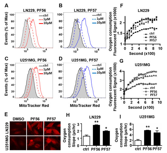 FAK inhibition increases MitoTracker uptake into mitochondria and oxygen consumption in LN229 and U251MG cells. (A–D) Flow cytometry analysis of MitoTracker stained cells treated with PF573228 (PF57) or PF562271 (PF56) for 16 h at 1 and 10 μM, respectively. (E) Representative immunofluorescent images of the MitoTracker labeled LN229 and U251MG in the presence of PF56 or PF57 (400×). (F,G) Oxygen consumption curve in cells treated with PF56 or PF57 at 10 μM. (H,I) Cellular oxygen consumption rate (slope) calculated based on the oxygen consumption curve in cells treated with 10 μM FAK inhibitors PF56 or PF57. All experiments were repeated at least three times. Data are represented as mean ± SE, * p < 0.05, ** p < 0.01.