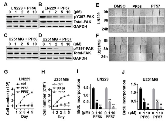 Blockade of FAK activation inhibits migration and proliferation in LN229 and U251MG cells. (A–D) FAK inhibitor PF562271 (PF56) or PF573228 (PF57), reduced the levels of the active form of FAK (pY397-FAK) in a dose-dependent manner. FAK activation was inhibited over 90% at 10 μM in both cell lines. (E,F) FAK inhibitors PF56 and PF57 reduced cell migration in a wound scratch heal assays (at 10 μM of PF56 and PF57, 24 h). (G,H) Cell growth in the presence of 10 μM PF56 or PF57 as measured by direct cell counts. (I,J) Cell proliferation measured by BrdU proliferation assays in the presence of 10 μM PF56 or PF57. All experiments were repeated at least three times. Data are presented as mean ± SE. ** p < 0.01.