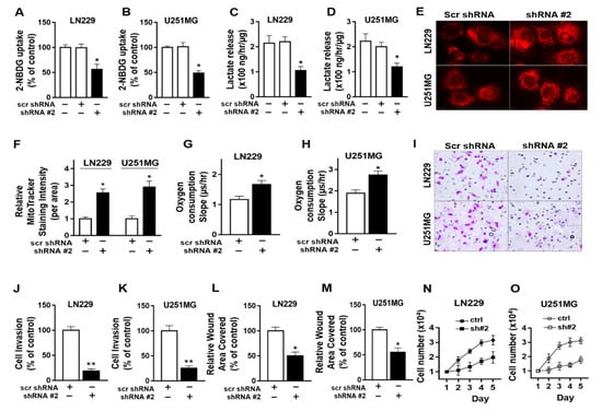 Protein arginine methyltransferase 5 (PRMT5) knockdown inhibits glycolysis, promotes mitochondria function, and decreases invasion and migration in glioblastoma multiforme (GBM) cells. LN229 and U251MG cells were plated on osteopontin (10 μg/mL) coated plates. PRMT5 knockdown by shRNAs was confirmed and published [24]. (A,B) Uptake of glucose analog 2-NBDG was reduced in cells with PRMT5 knockdown. (C,D) Lactate levels in culture medium decreased in cells with PRMT5 knockdown. (E–H) MitoTracker intensity and cellular oxygen consumption rate (slope) were decreased in cells with PRMT5 knockdown, indicating increased mitochondria function. (400× for e) (I–K) Invasion by Matrigel invasion assays (200× for I), (L,M) cell migration by wound closure assays, and (N,O) cell growth, were decreased in cells with PRMT5 knockdown. All experiments were repeated at least three times. Data are represented as mean ± SE, * p < 0.05, ** p < 0.01.