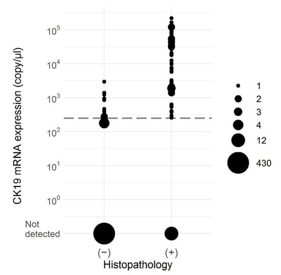 - Terrenato, I.; D’Alicandro, V.; Casini, B.; Perracchio, L.; Rollo, F.; De Salvo, L.; Di Filippo, S.; Di Filippo, F.; Pescarmona, E.; Maugeri-Saccà, M.; et al. A cut-off of 2150 cytokeratin 19 mRNA copy number in sentinel lymph node may be a powerful predictor of non-sentinel lymph node status in breast cancer patients. PLoS ONE 2017, 12, e0171517. [Google Scholar] [CrossRef]