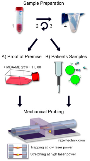 Sample preparation and measurement: 1. Whole blood sample diluted with PBS; 2. density gradient centrifugation; 3. depletion of red blood cells using microbeads against glycophorin a and 4. resulting PBMC were resuspended and (A) spiked with MDA-MB 231 breast cancer cells and HL-60 leukemia cells for proof of premise experiments to mimic CTC samples or (B) incubated with microbeads against CD45 to deplete hematopoietic cells and thus enrich possible CTC candidates from clinical samples. Spiked respective remaining cell suspensions were applied to the optical stretcher and rheological parameters were measured.