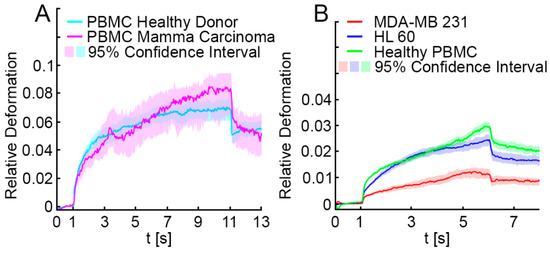 Relative deformation curves of blood cells and MDA-MB 231 and HL-60. (A) PBMC from healthy donors (cyan line, n = 3) and from patients with breast cancer (magenta line, n = 2) exhibited the same deformation behavior, here shown in a representative example at 1200 mW stretching power. Data obtained from PBMC measurements were pooled to serve as a reference for further analysis (n = 5). Relative deformations and elliptic deformations of the samples were not distinguishable (for elliptic deformations see Appendix A, Figure A1). (B) We analyzed the relative deformation of PBMC samples (green line). We then measured the relative deformation of breast cancer cells from the highly invasive breast cancer cell line MDA-MB 231 (red line) and the leukemia cell line HL-60 (blue line). The deformation patterns of the three cell types were significantly different (p < 0.001) at 875 mW. In comparison to MDA-MB 231 cells, PBMC were much softer and showed a more than twofold elevated relative deformation (median relative deformation MDA-MB 231 = 0.012, median relative deformation PBMC = 0.028). HL-60 was softer than MDA-MB 231, but stiffer than PBMC (median relative deformation HL-60 = 0.023). Elliptic deformation showed the same trend and statistically significant differences (p < 0.001, Appendix A, Figure A1).