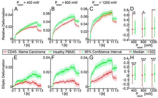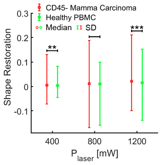 After demonstrating that the OS permits cell-mechanics-based discrimination of cancer cells from white blood cells, clinical samples from patients with breast cancer (n = 12) were investigated. Density gradient centrifugation followed by depletion of erythrocytes and leucocytes using microbeads against glycophorin a and CD45 were performed as described in the methods section. Subsequently, the remaining non-hematopoietic cells, which are potential CTCs, were measured in the OS. The mean proportion of CD45 negative, non-hematopoietic cells in relation to the CD45 positive, hematopoietic population was 3.26% in samples from breast cancer patients, and 0.25% in samples from healthy donors (Appendix A, Table A1). In total, we analyzed 3641 non-hematopoietic cells derived from 12 patients with breast cancer. Measurements were carried out using three different laser powers P1 = 400 mW, P2 = 800 mW and P3 = 1200 mW, resulting in three different step stresses (estimates of the step stresses: σ1 = 0.38 Pa, σ2 = 0.76 Pa and σ3 = 1.14 Pa, corresponding estimates of the peak stretching force: F1 = 80 pN, F2 = 160 pN and F3 = 240 pN) [26]. Testing cells at three different laser powers covers a broader force regime, which may trigger different responses from cells. In total, 2541 CD45 positive PBMC from three healthy donors and two patients with breast cancer were measured under the same conditions as a control. For each laser power (400, 800 and 1200 mW) the combined deformation curves of non-hematopoietic CTC-candidates from mamma carcinomas compared to PBMC are shown in Figure 3A–C. The relative deformation behavior of the different cells at the three stretching powers appeared to be quite similar. Nevertheless, comparison of the cell type specific elliptic deformation draws another picture. The relative deformation takes only the process of elongation into account. The Poisson effect that describes the shortening or expansion of a material in directions perpendicular to the direction of stretching illustrates that elongation alone falls short as a descriptor of cell resistance. Elliptic deformation, however, describes the change in cell shape in the OS more precisely. The ellipticity of CTC candidates and PBMC differed significantly at each laser power. For PBMC the elliptic deformation was increased by a factor of 2 (p (P = 400 mW) = 0.001, p (P = 800 mW) < 0.001 and p (P = 1200 mW) < 0.001), Figure 3E–F. In addition, we analyzed the mechanosensitive active response of a cell triggered by external forces induced by the laser trap. The active Kelvin–Voigt model can be applied for active, linearly increasing counter forces caused by a radially contracting cell in suspension and was used to estimate the contraction force of a cell opposing optical stretching [34]. Active contractions were equally observed in all cell types at all force regimes. Median activity values of cells were 0.079 Pa/s for CTC candidates from patients with breast cancer and 0.074 Pa/s for PBMC. The ratio of active to non-active cells in all samples was 0.6 ± 0.05 (SD) and did not differ from this range between all measured cell types. A cell was considered active when the activity parameter given by the active Kelvin–Voigt model exceeded a threshold of 0.001 Pa/s. Values below that threshold were considered non-active, as lower values vanish in the random noise of the fit. After the end of being stretched by the laser-induced step stress, cells were tending to restore their original shape during relaxation (Figure 4). An adequate measure of shape restoration was the difference between the elongation at 1.5 s after the end of optical stretching compared to the elongation at the end of the step stress. Interestingly, we revealed that PBMC showed significantly decreased shape restoration, i.e., a more viscous, dissipative behavior, compared to CTC candidates at 400 mW and 1200 mW (p < 0.001, Figure 5).