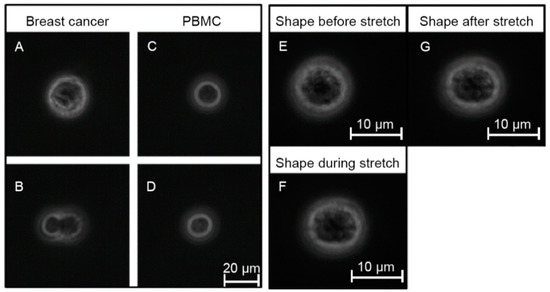 Representative phase contrast images obtained during mechanical probing using the optical stretcher. (A) Possible CTC candidate and (B) cell cluster—both detected in the CD45 depleted cell suspension from a breast cancer patient. (C,D) show PBMC after density gradient centrifugation, (E–G) show the shape of a breast cancer derived CTC candidate with particularly low mechanical resistance before, during and after optical stretching demonstrating that mechanical changes are very small.